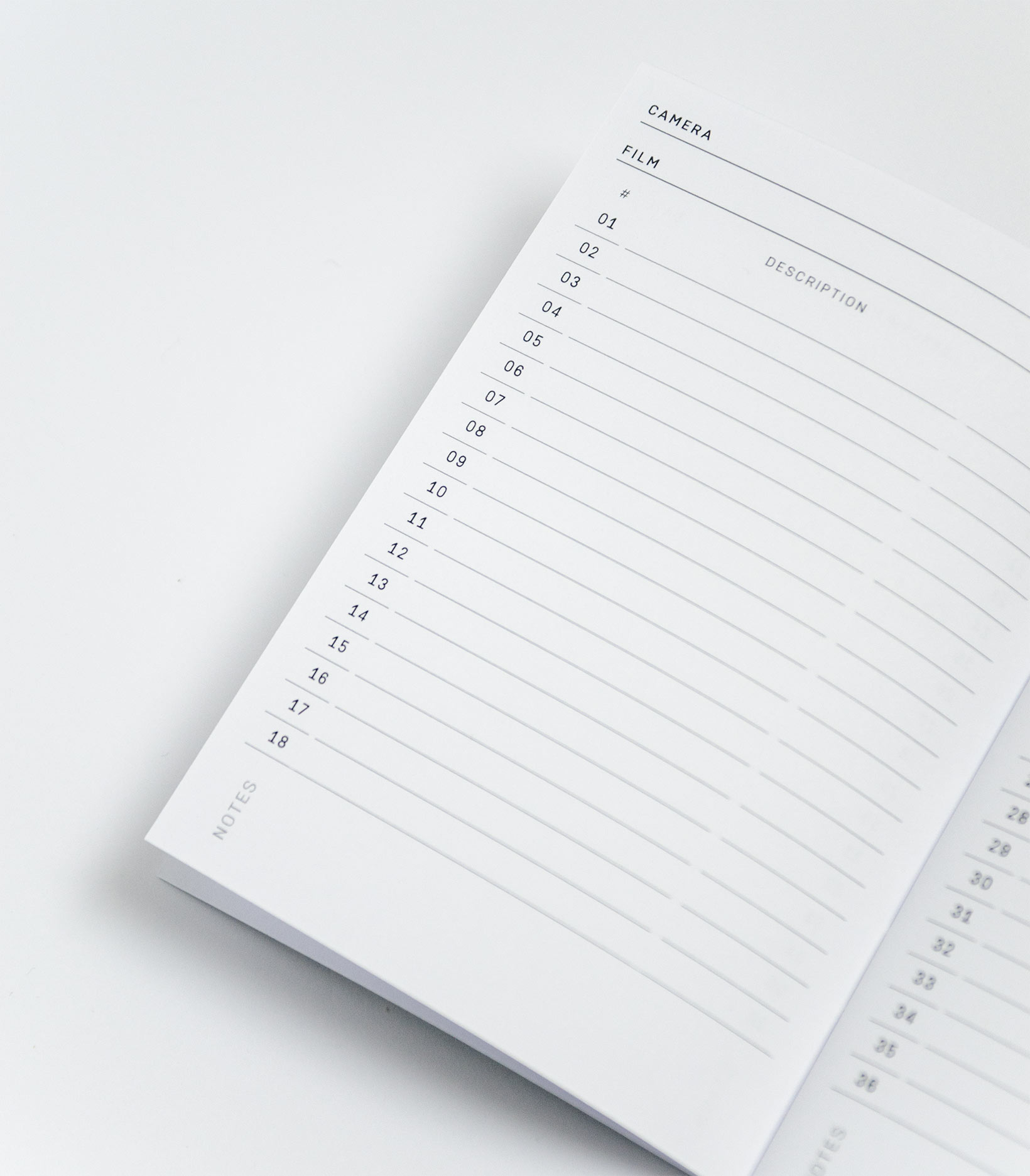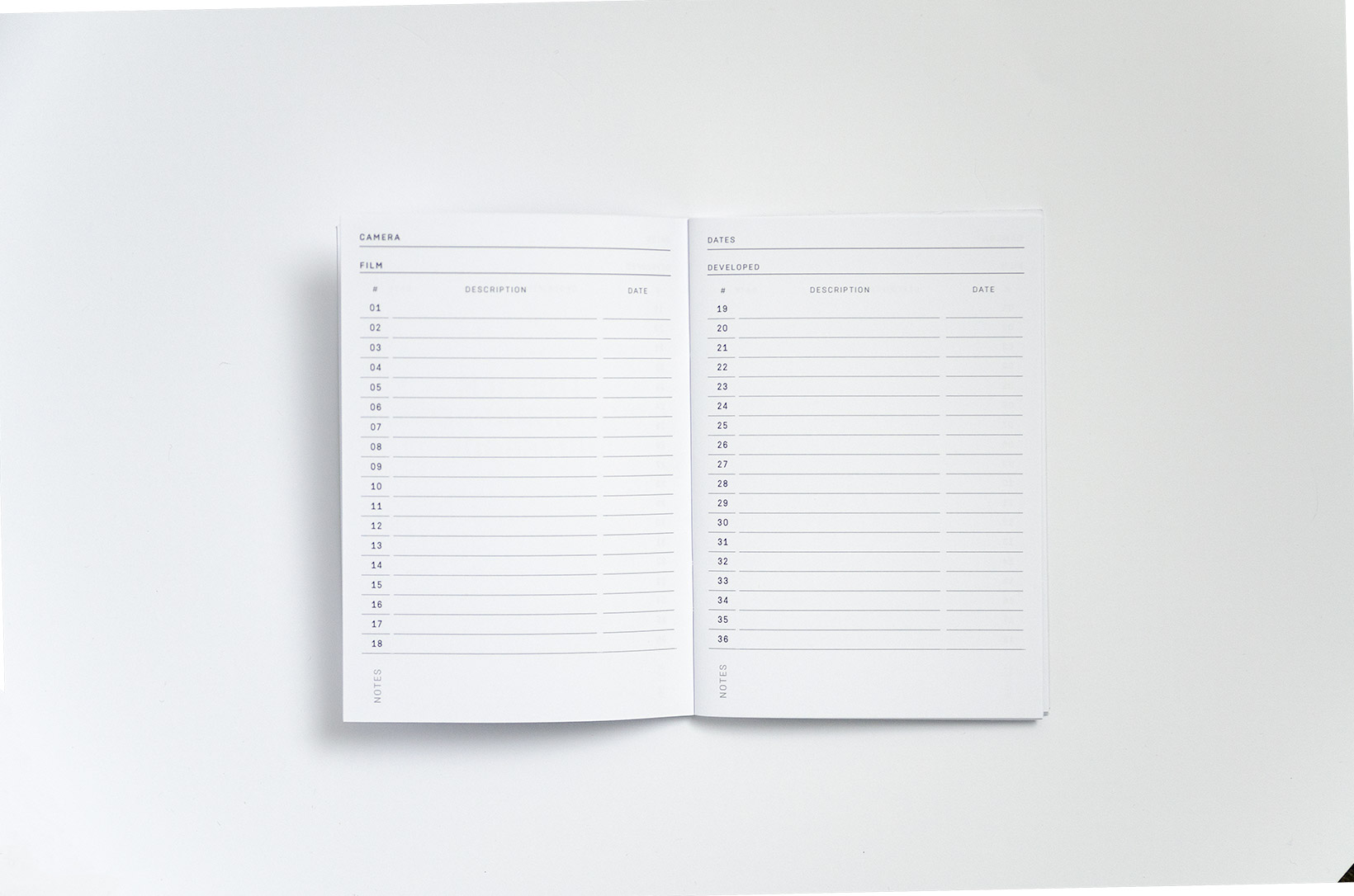Keep track of your rolls with The Film Photographer's Notebook – a bespoke product that fits right into your shoot, dev, scan and file system. Handy for the traveler, experimenter or prolific shooter. Each notebook can document 24 rolls with up to 36 exposures.